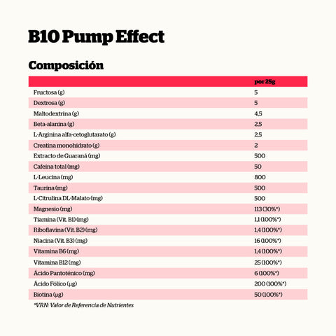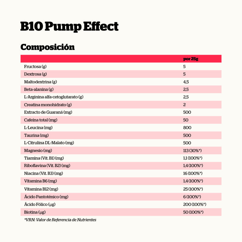 B10 es un pre-entreno desarrollado por NutriSport para entrenamientos y competiciones de alta intensidad.Su fórmula combina aminoácidos clave, creatina monohidrato y extracto de guaraná (fuente natural de cafeína) para empezar la actividad en un estado más activo. Además, aporta magnesio, es rico en vitaminas del grupo B y contiene vitamina C.