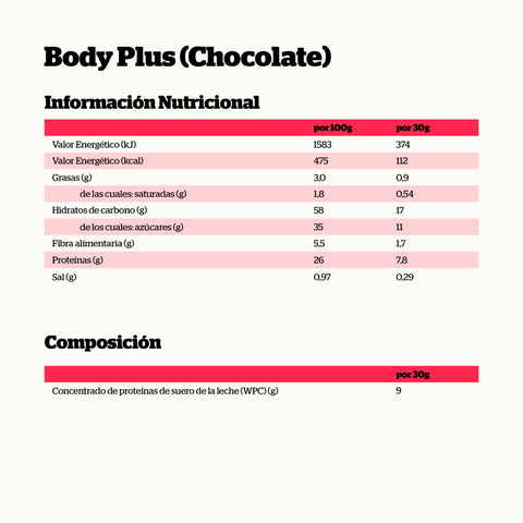 Body Plus es un batido en polvo a base de proteína concentrada de suero (WPC), hidratos de carbono de cadena corta y larga y un aporte de vitaminas A, D, E, C y grupo B.Indicado para quienes buscan incrementar el aporte calórico de la dieta con el objetivo de aumentar la masa muscular.